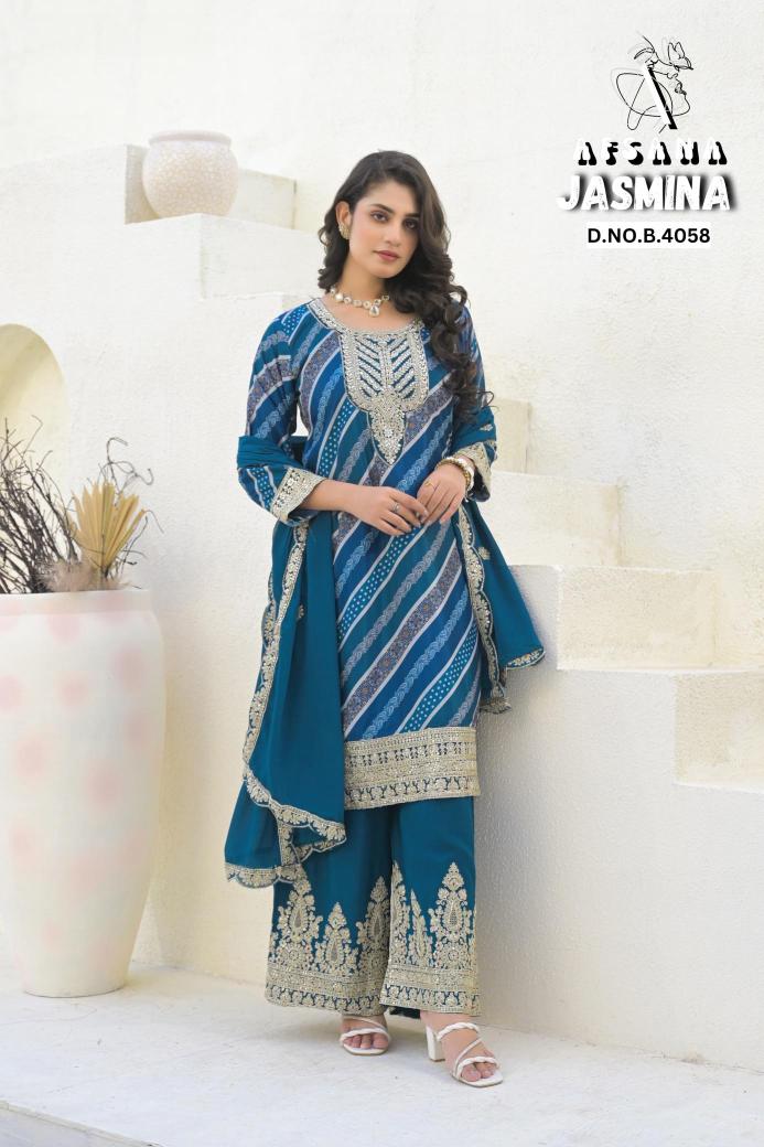 | Other Detail | Afsana jasmina Designer salwar kameez supplier in surat Fabric:- SIZE:- L XL XXL 3XL |