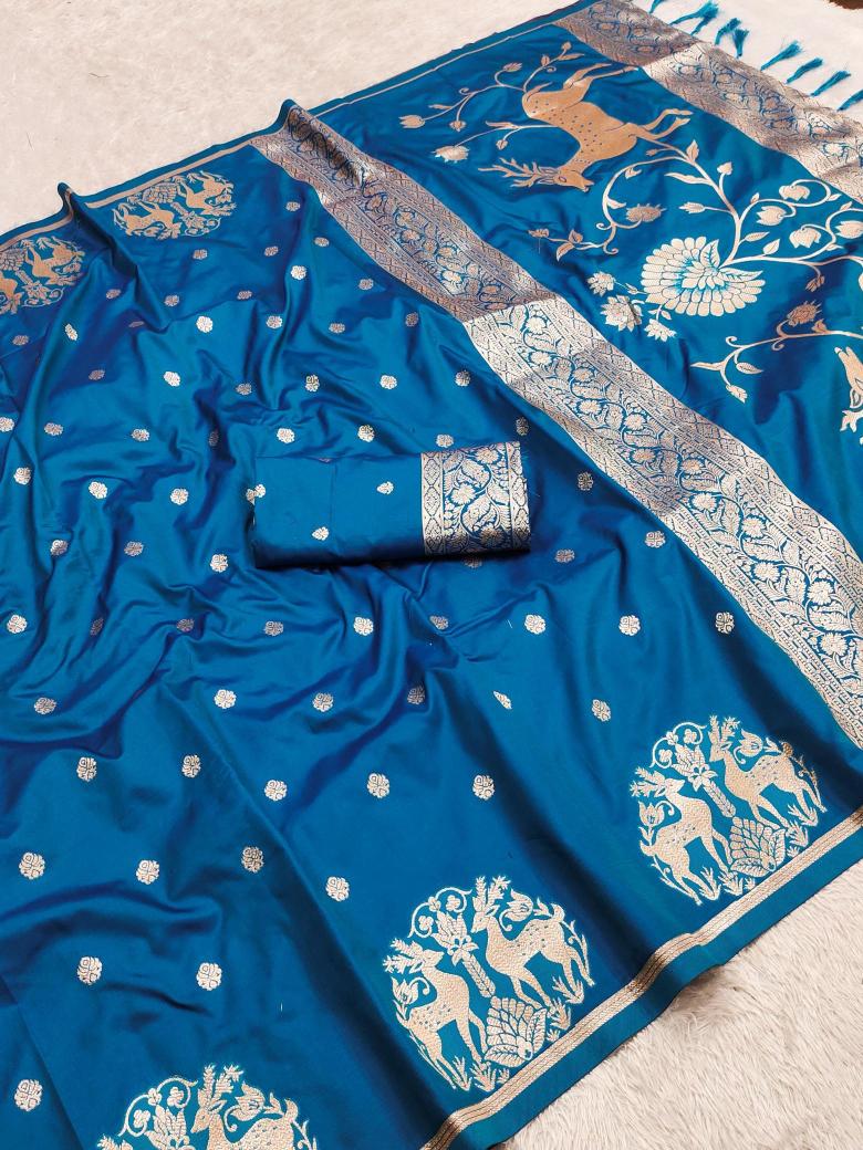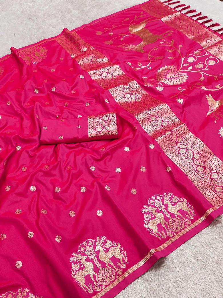 | Other Detail | Anupama hiran Bulk Saree Suppliers in Surat Saree :- Soft Banarasi silk saree with zari weaving motifs touchup design all over the saree & Zari weawing Hiran designer pallu with Zari weaving Hiran border & Tassels attached at Pallu End. Blouse :- Soft silk weawing blouse piece with sleeve border Rate : 999/-😊 11 Unique Colours Available. 2045 |