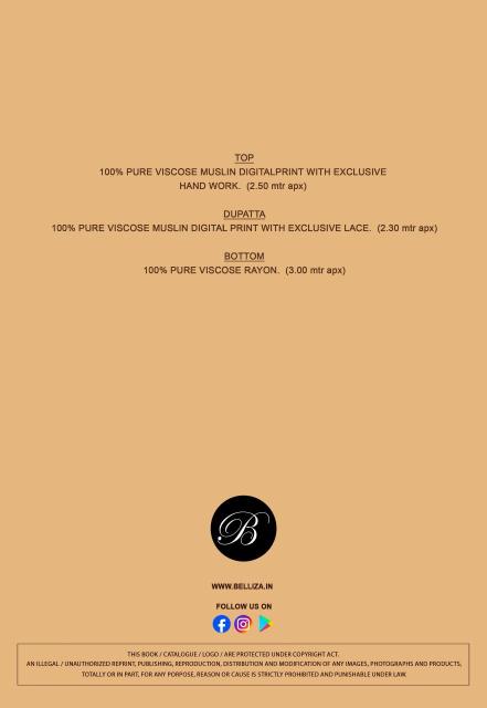| Other Detail | Belliza kanika vol 4 Wholesale dress suppliers in Kolkata 🔺Top: 100% Pure Viscose MUSLIN DIGITAL with Exclusive Heavy HANDWORK (2.50 mtrs apx) 🔺Dupatta: 100% Pure VISCOSE MUSLIN DIGITAL BOX PRINT WITH LACE (2.30 mtrs apx) 🔺Bottom: 100% Pure Viscose Rayon Salwar (3 mtrs apx) 🔺Pcs: 03 🔺 Rate: 875/- 7040 |