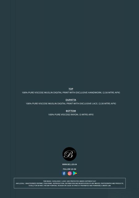 | Other Detail | Belliza kanika vol 5 indian dress wholesale in india 🔺Top: 100% Pure Viscose MUSLIN DIGITAL with Exclusive Heavy HANDWORK (2.50 mtrs apx) 🔺Dupatta: 100% Pure VISCOSE MUSLIN DIGITAL BOX PRINT WITH LACE (2.30 mtrs apx) 🔺Bottom: 100% Pure Viscose Rayon Salwar (3 mtrs apx) 🔺Pcs: 03 🔺 Rate: 875/- 7040 more products:- pakistani wholesale replica suits in delhi |
