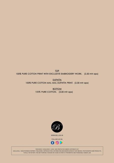 | Other Detail | Belliza naira vol-129 Dress materials wholesale suppliers 🔺Top: 100% Pure Cotton Digital Prints with Exclusive Heavy Self Embroidery (2.50 mtrs apx) 🔺Dupatta: 100% Pure MAL MAL Cotton Dupatta Digital Print (2.30 mtrs apx) 🔺Bottom: 100% Pure Cotton (3 mtrs apx) 🔺Pcs: 08 🔺 Rate: 575/- 7040 more products:- wholesale bandhani dress material |