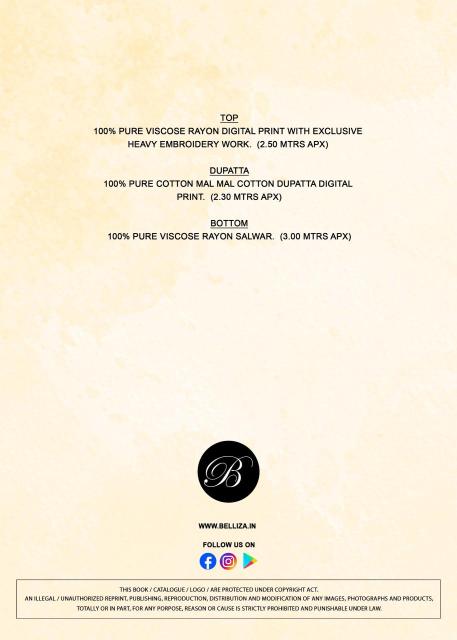 Looking for Belliza riwayat vol 14 wholesale dress material in mumbai with price near me Full Catalouge at Best Price? Buy Now Belliza riwayat vol 14 wholesale dress material in mumbai with price near me at Wholesale Rate of Rs 4600 with Total 8 Pcs from authroized dealer and supplier of Brand. Cost of Each piece is just only Rs 575 which is very low and affordable price to resale the product in your retail store. kapdawholesale is Surat based Wholesale Supplier & Dealer of Brand. Click on Brand name to Know more about BELLIZA Brand's products.
