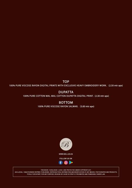 | Other Detail | Belliza riwayat vol 15 Dress materials exporters in ahmedabad 🔺Top: 100% Pure Viscose Rayon Digital Print with Exclusive Heavy Self Embroidery (2.50 mtrs apx) 🔺Dupatta: 100% Pure MAL MAL Cotton Dupatta Digital Print (2.30 mtrs apx) 🔺Bottom: 100% Pure Viscose Rayon (3 mtrs apx) 🔺Pcs: 08 🔺 Rate: 575/- 7040 more products:- gota patti lehenga wholesale |