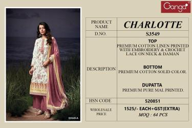 | Other Detail | Ganga charlotte 3549 Designer dress materials in Kolkata TOP BOTTOM DUPATTA 7031 |