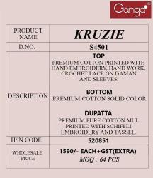 | Other Detail | Ganga kruzie 4501 Designer dress materials in Gujarat TOP BOTTOM DUPATTA RATE: 7031 more products:- designer salwar kameez wholesale in chennai |
