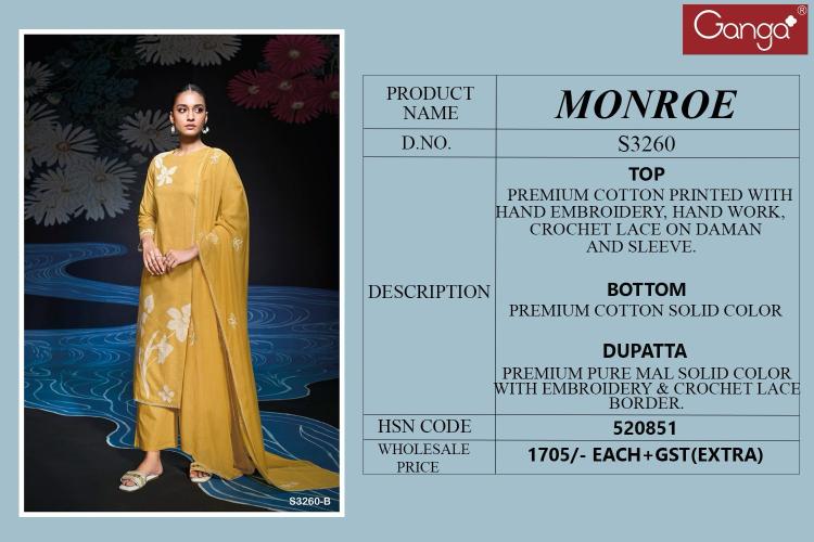 | Other Detail | Ganga Monroe Cotton Printed Embroidered Salwar Suit Collection in India