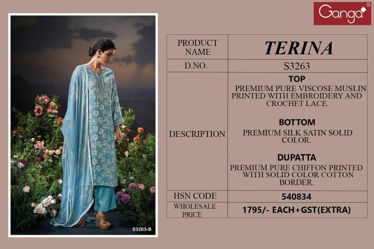 | Other Detail | Ganga Terina Viscose Muslin Printed Salwar Suits Collection wholesale market in Surat