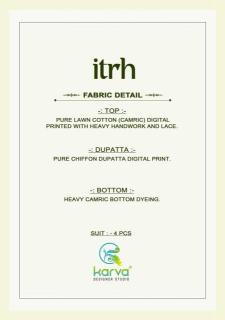 | Other Detail | Karva designer studio itrh Party wear dress materials in Kolkata TOP:- PURE LAWN COTTON CAMRIC DIGITAL PRINTED WITH HANDWORK AND LESS BOTTOM:-PURE CAMRIC DYIENG DUPATTA:- PURE CHIFFON DIGITAL PRINT