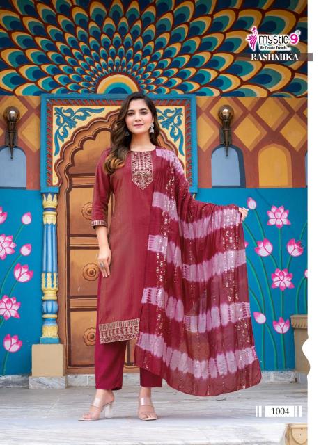 | Other Detail | Mystic9 rashmika vol 1 Branded kurtis wholesale 👗 TOP : PREMIUM QUALITY HEAVY VERTICAN SHIMMER DOBBY (BUTTI) WITH SLEEVES LOCK and EMBROIDERY ON FRONT, SLEEVE & DAMAN🪡 👖 BOTTOM : PREMIUM QUALITY VERTICAN STRAIGHT PANT WITH INTERLOCK & EXCLUSIVE POCKET.✨️ 🧣 DUPATTA: CHANDERI DUPATTA WITH FANCY SEQUENCE IMMERSED IN TIE-DIE.🌟