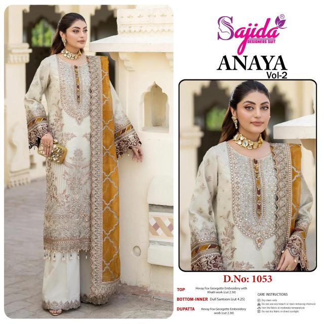| Other Detail | Sajida anaya vol 2 Salwar Kameez Wholesale supplier in india ๐๐ปFabric details ๐๐ป ๐ Top : GEORGETTE WITH HEAVY EMBROIDERED ๐Bottom :SANTOON ๐ณ๏ธโ๐Dupatta : FOX GEORGETTE WITH HEAVY EMBROIDERED INNER :- SANTOON 7040 |